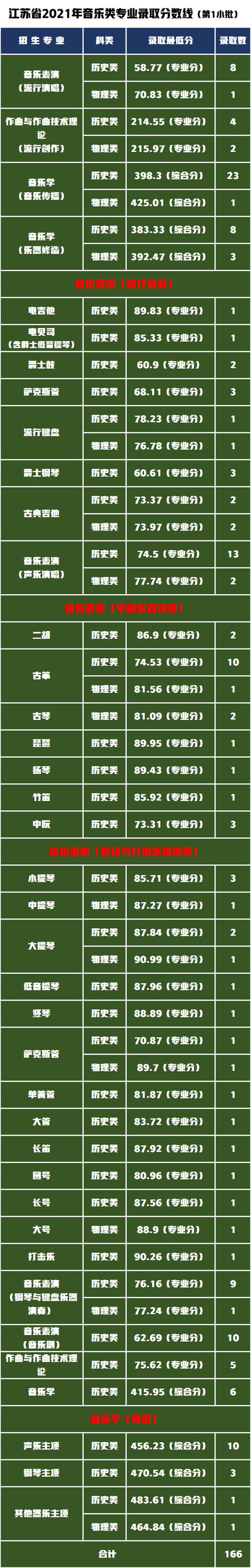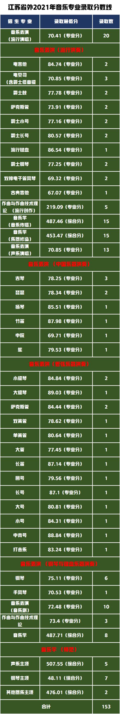 2021年音乐类专业共录取319人,其中江苏省内录取了音乐类艺考生166人,江苏省以外录取了153人。