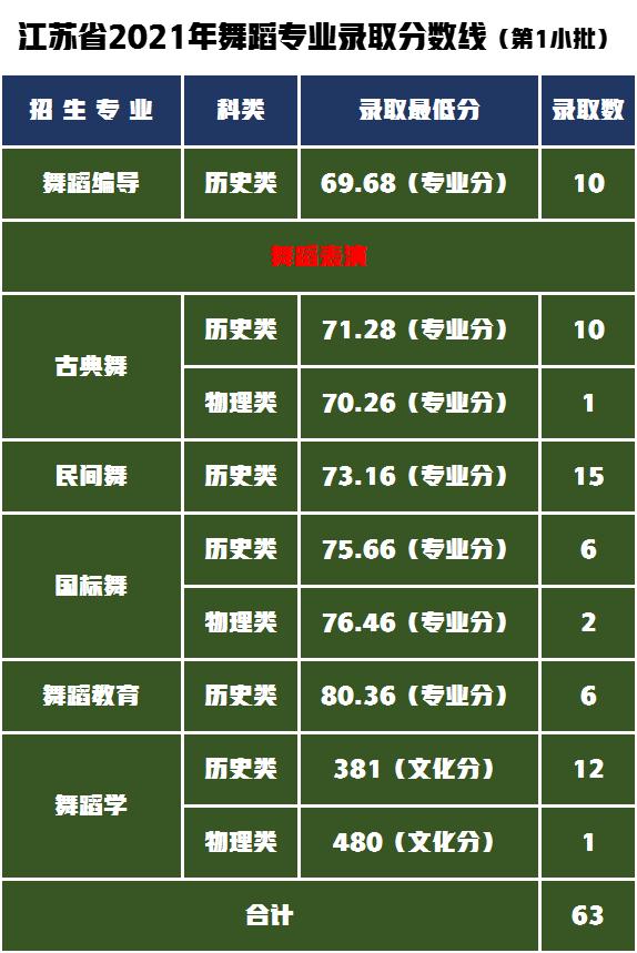 江苏省舞蹈学考生专业成绩合格,文化分达江苏省普通类本科相应批次省控线 80%,按照高考文化成绩最低录取至381分。