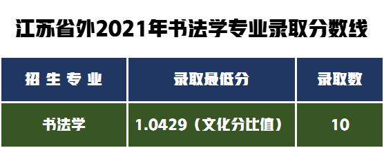 外省书法专业统考成绩合格,校考成绩取得校考合格证,文化分达考生所属省普通类本二文科或理科省控 线 80%,按文化分比值择优录取10人,最低文化分比值录取至1.0429。