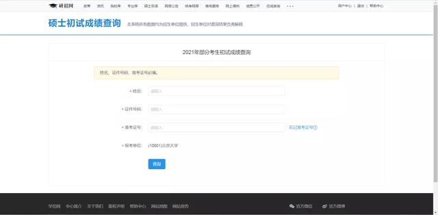以北京大学为例,初试查询通道为如下链接,把链接中的5位数字换成报考院校的学校代码,就能查到自己院校的成绩查询页面了。