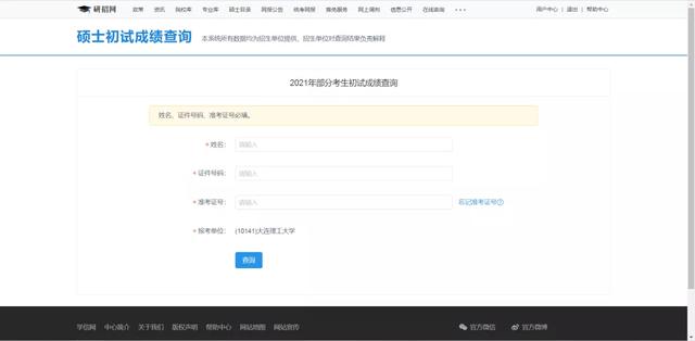 比如,大连理工大学的学校代码是10141,把“10001”换成“10141”后复制链接到浏览器查看,就能看到大连理工大学初试成绩查询页面。
