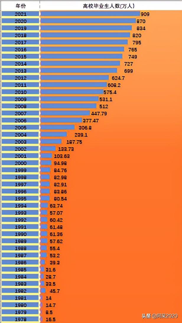 以下为自1978年以来的大学毕业生人数统计。