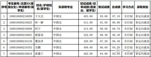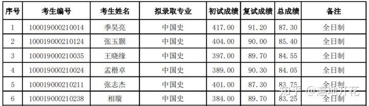 招生目录参考20招生学习方式全日制研究方向01. 先秦史02. 秦汉史03. 魏晋南北朝史04. 隋唐史05. 宋辽金史06. 元史07. 明史08. 清史09. 中国历史地理10. 历史文献学11. 敦煌吐鲁番文书12. 中国少数民族史13. 古代中外关系史14. 古代中西交通史15. 中国古代社会史16. 经济史17. 全球史18. 中国近代史19. 中华民国史20. 中国现代史21. 中华人民共和国史22. 近现代中外关系史23. 中国近现代思想文化史24. 中国近现代社会史考试科目① 101 思想政治理论② 201 英语一 或 202 俄语 或 203 日语 或 253 法语 或 254 德语③ 667 历史学基础(中国史)参考书目北师大版 历史学基础课系列教材《中国古代史》 朱绍侯编《中国古代史》 翦伯赞《中国史纲要》 李侃、李时岳《中国近代史》 北师大版 历史学基础课系列教材《中国近代史》 王桧林《中国现代史》标准五件套另有张帆老师的《中国古代简史》,很值得一看。复试线20年:总分380 政治英语55/专业课18019年:总分350 政治英语55/专业课18018年:总分365 政治英语50/专业课180录取名单 2020录取:
