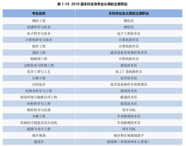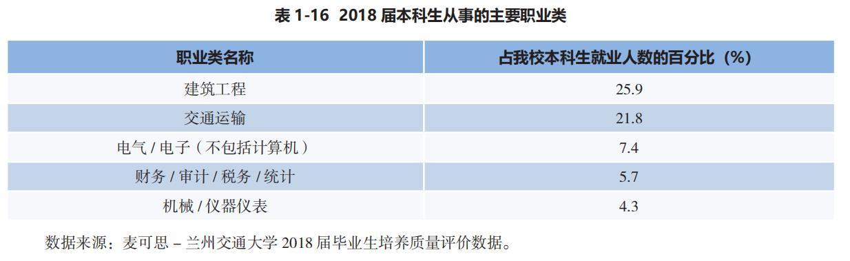 2018 届本科生从事的主要职业类如下表所示。 2018 届本科生就业量较大的职业类为建筑工程(25.9%)、交通运输(21.8%)等。