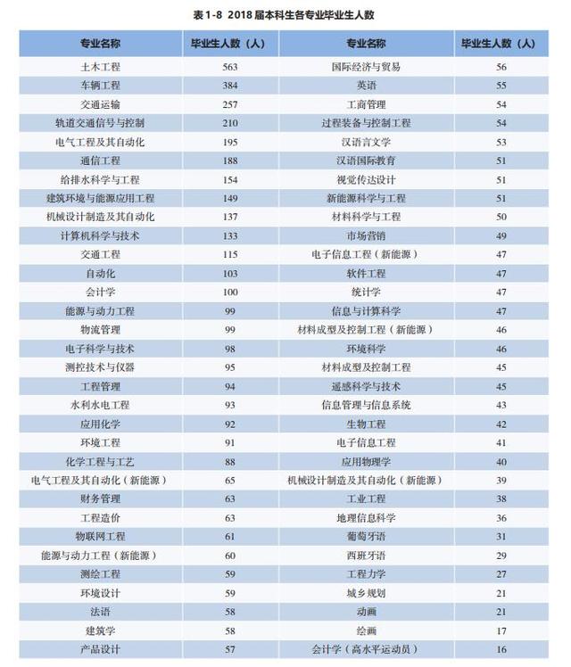 2018 届本科生分布于土木工程、车辆工程、交通运输、轨道交通信号与控制等 64 个专业。