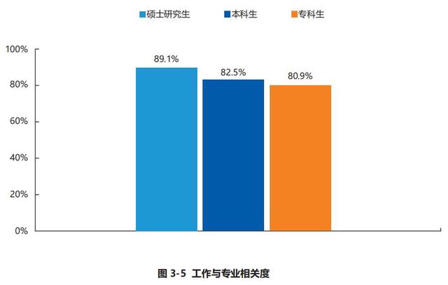 2018 届毕业生认为目前就职岗位与所学专业的相关度为 83.3%,其中硕士研究生的专业相关度为89.1%,本科生的专业相关度为 82.5%,专科生的专业相关度为 80.9%,可见毕业生所学专业知识及技能与实际工作的契合度较高,能够学以致用。