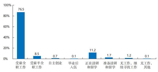 2018 届本科生最主要的去向是“受雇全职工作”(76.5%)。