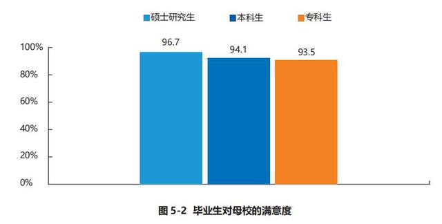 2018 届硕士研究生、本科生、专科生对母校的总体满意度分别为 96.7%、94.1%、93.5%。