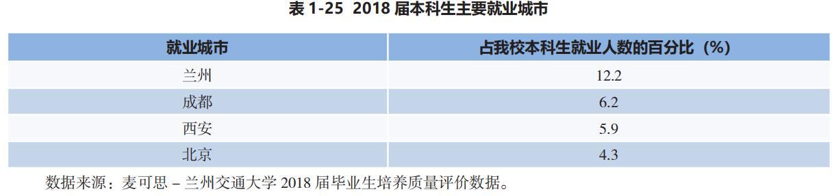 2018 届就业的博士研究生均在甘肃省兰州市就业;2018 届就业的硕士研究生、本科生、专科生中,分别有 26.9%、20.4%、42.8% 的人在甘肃省就业;2018 届硕士研究生、本科生、专科生就业量较大的城市均为兰州(分别为 21.6%、12.2%、24.8%)。