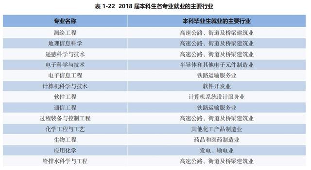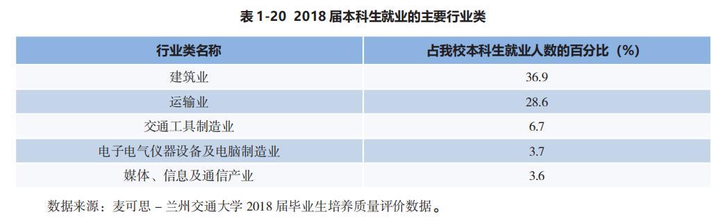 2018 届本科生就业的主要行业类如下表所示。 2018 届本科生就业量较大的行业类为建筑业(36.9%)、运输业(28.6%)。