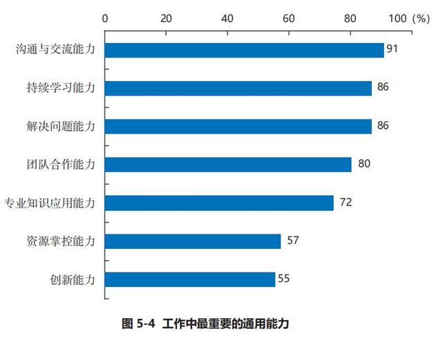 2018 届本科生认为工作中最重要的通用能力是“沟通与交流能力”(91%),其次是“持续学习能力”、“解决问题能力”(均为 86%)。