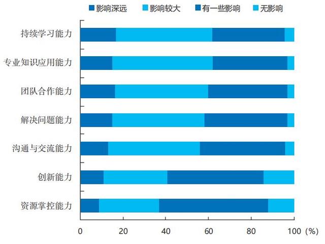 2018 届本科生受母校学习经历影响明显,比例较高的通用能力是“持续学习能力”、“专业知识应用能力”(均为 62%),其次是“团队合作能力”(60%)。