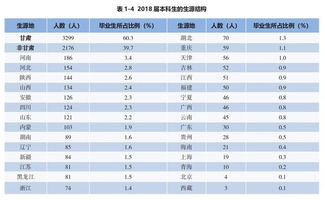 2018 届毕业生以甘肃生源为主,各学历层次中,博士研究生、硕士研究生、本科生、专科生毕业生甘肃生源所占比例分别有 53.8%、47.0%、60.3%、80.4%。