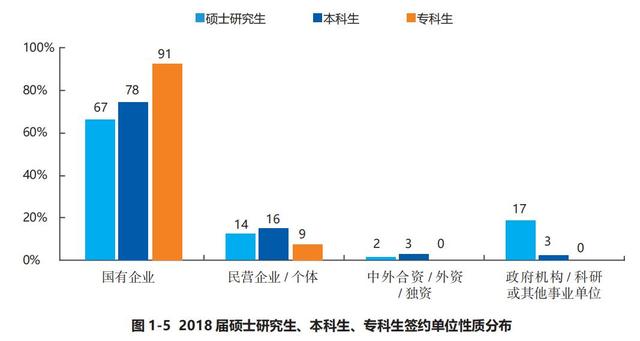 2018 届博士研究生就业的用人单位类型均为事业单位占比 100%,2018 届硕士研究生主要就业的用人单位类型为国有企业占比 67%,2018 届本科生主要就业的用人单位类型为国有企业占比 78%,2018届专科生主要就业的用人单位类型为国有企业占比 91%。