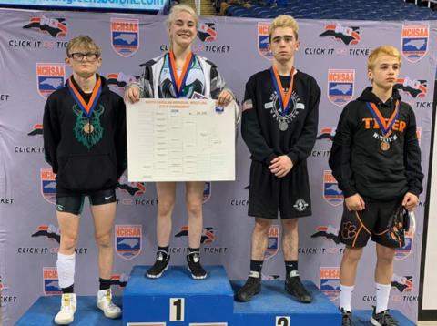 据美联社27日报道,北卡罗来纳州高中体育协会(North Carolina High School Athletic Association)在其网站上表示,一名叫海文·费奇的女孩成为了该州高中个人摔跤赛中的首位女性冠军,她在22日48公斤级的比赛中获胜。从照片中可以看出,登上最高领奖台的费奇笑容满面,与被击败的3名男孩的表情形成了鲜明对比。