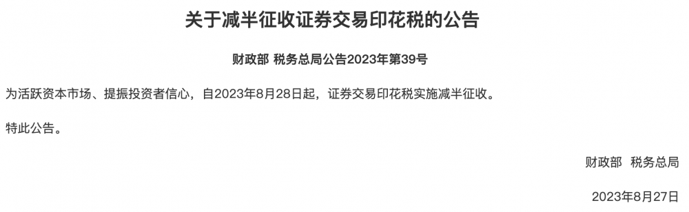 8月27日,据财政部网站消息,财政部、税务总局发布《关于减半征收证券交易印花税的公告》,公告称,为活跃资本市场、提振投资者信心,自2023年8月28日起,证券交易印花税实施减半征收。