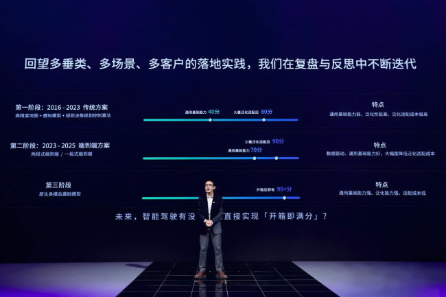 第一阶段(传统方案):感知小模型、高精地图与规则算法堆叠出约40分的基础,通过无休止的地域泛化,勉强接近80分,通用性极弱,复制成本高得惊人。