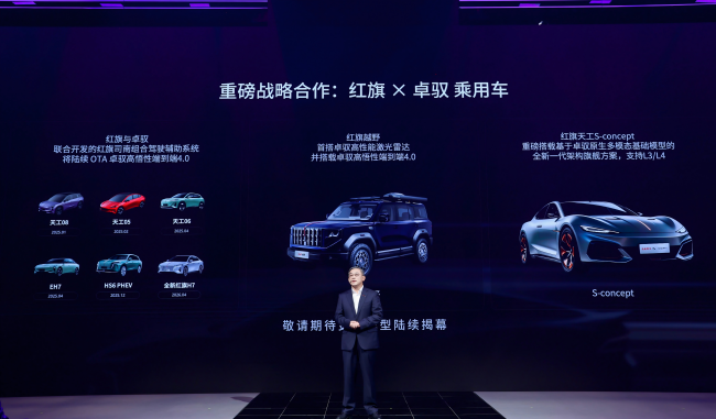 在乘用车领域,这场合作早已开花结果:红旗与卓驭联合开发的红旗司南组合驾驶辅助,已在HS6、天工05等车型上量产,高悟性端到端4.0模型即将OTA。更引人遐想的是,本次亮相的红旗天工S概念车,直接采用了基于卓驭原生多模态基础模型的全新一代架构,剑指L3/L4,这几乎是移动物理AI的首次实体预演。