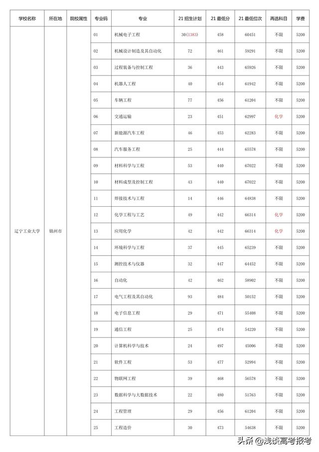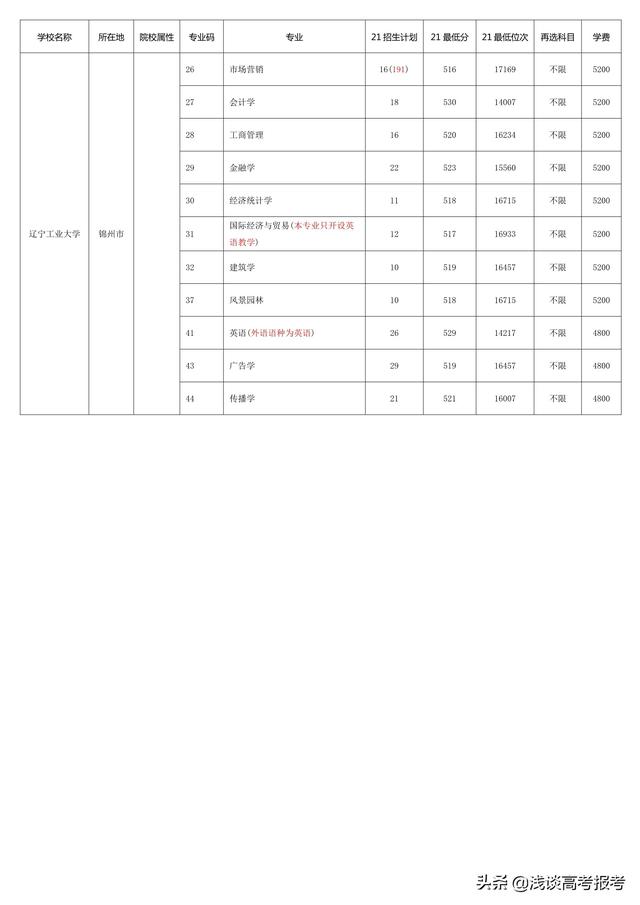 附2021辽宁地区辽宁工业大学各专业录取最低分数线
