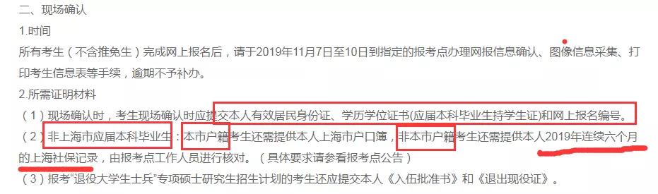非应届本科毕业生:本市户籍考生还需提供本人上海市户口簿,非本市户籍考生还需提供本人2019年连续六个月的上海社保记录,由报考点工作人员进行核对。(具体要求请参看报考点公告)