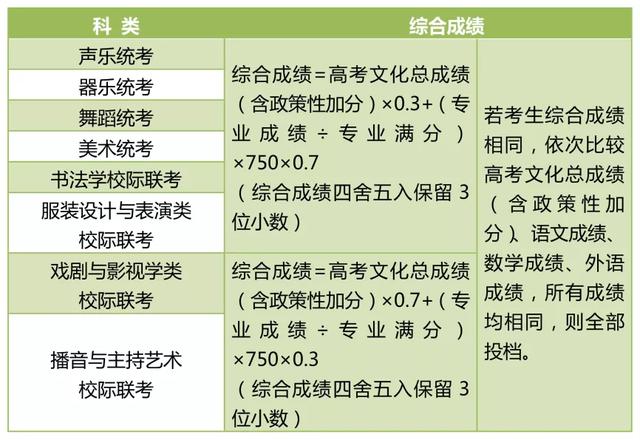 2.根据综合成绩的位次情况,合理确定拟填报院校。我省艺术类各类别之间平行志愿投档综合成绩构成不同(见下表),考生应根据自己高考文化总成绩和艺术统考(校际联考)专业成绩准确计算出综合成绩。我省将在文化成绩公布后公布考生的综合成绩分布统计表,考生在知线知分知位次的情况下,综合考虑院校办学实力、往年录取情况,结合本人意愿进行填报。