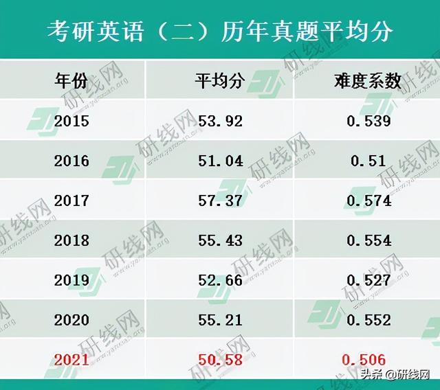 从2015~2021年历年平均分来看,考研英语(二)平均分最高为2017年57.37,最低分为2021年50.58,相比英语(一)来说,英语(二)近年来的难度系数变化不大,2021年为史上最难。