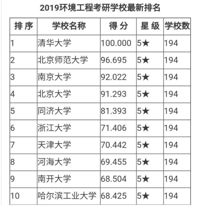 就数据来看19年环境工程考研学校排名前十的有:清华大学、北京师范大学、南京大学、北京大学、同济大学、浙江大学、天津大学、河海大学、南开大学以及哈尔滨工业大学。