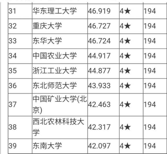 最后我们来看一下排名三十一到三十九的大学分别是:华东理工大学、重庆大学、东华大学、中国农业大学、浙江工业大学、东北师范大学、中国矿业大学(北京)、西北农林科技大学、东南大学。