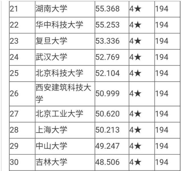 排名二十一到三十的大学分别是:湖南大学、华中科技大学、复旦大学、武汉大学、北京科技大学、西安建筑科技大学、北京工业大学、上海大学、中山大学、吉林大学。