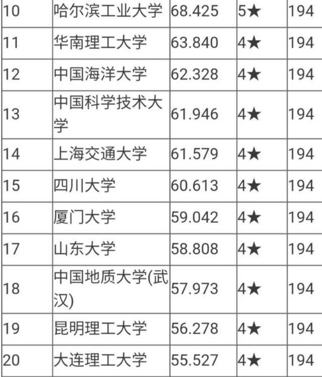 排名第十一到二十的大学有:华南理工大学、中国海洋大学、中国科技大学、上海交通大学、四川大学、厦门大学、山东大学、中国地质大学(武汉)、昆明理工大学、大连理工大学。