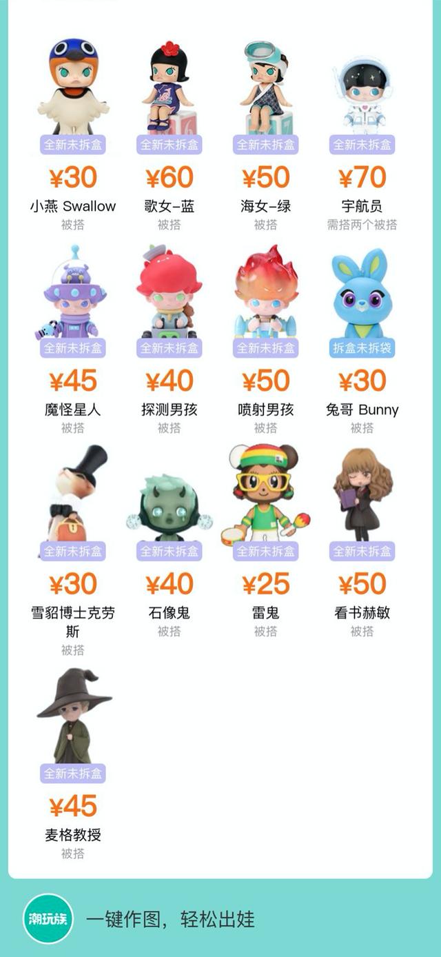 最初,转手盲盒的二级市场在闲鱼。2018 年闲鱼上有 30 万盲盒玩家交易成功,其中 Molly 的交易就超过 23 万单。但随着潮玩市场的日益成熟,用户也有了专门的交易工具——微信群+微信小程序。