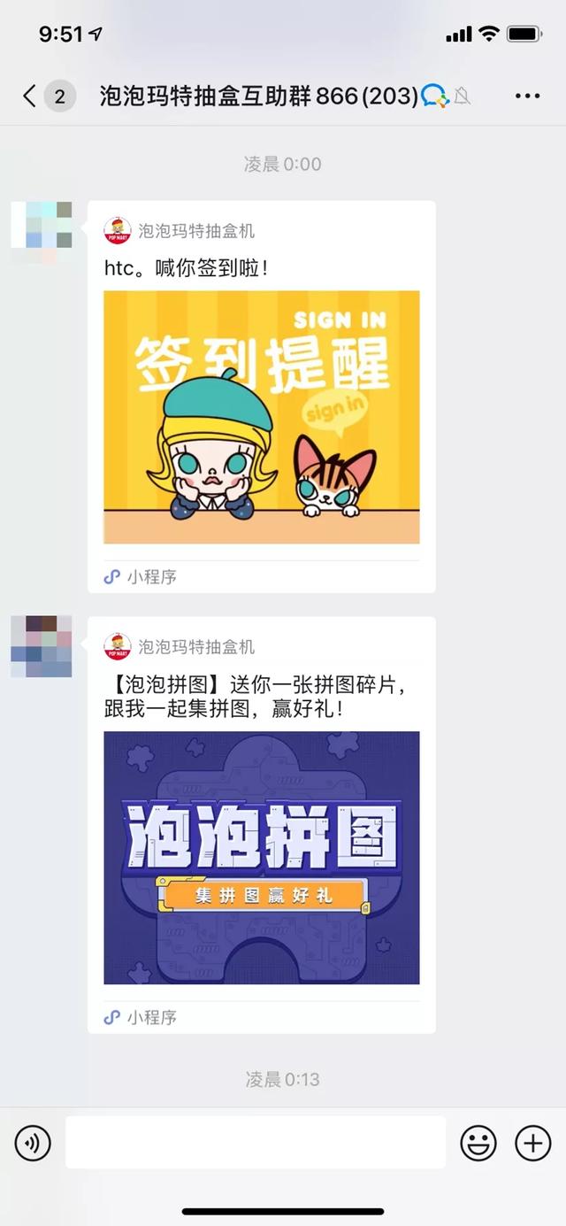 进入官方群有两种方式。一是在小程序完成购买后,新用户就能看到官方群聊的入口,此后找到同行帮忙猜盒、拼图更容易。二是线下购买过程中表现出了对品牌的强烈兴趣,就会被店员邀请进群,能在第一时间收到潮玩的补货通知。