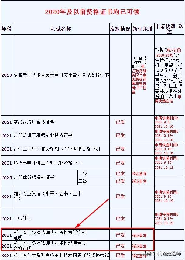 进入浙江人事考试网,点击合格证书,在浙江资格证书领取时间安排表中显示:2021年浙江省二级建造师执业资格考试合格证明、浙江省二级建造师执业资格增项考试合格证明已发,详情如下: