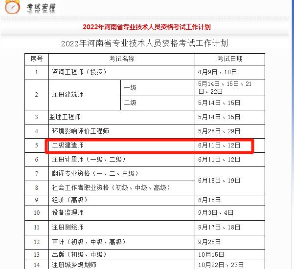 在河南公布的2022年考试计划工作表里面,可以看到二级建造师考试时间是在6月11日、12日,和其他已公布考试时间的地区保持一致,大家也可以按照这个时间安排备考计划了!